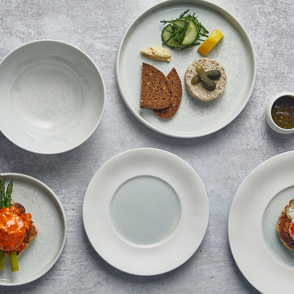 The Incise Porcelain Lustre collection features an elegant series of gourmet dishes, finished with a refined textured matt white glaze for added sophistication. The centre of each plate showcases a stunning reactive pearlescent glaze, creating a captivating focal point. Perfect for upscale settings, this range blends striking aesthetics with practical design, allowing chefs to create visually stunning and memorable presentations for any occasion.