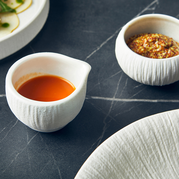 The Incise Porcelain Lucine collection features an elegant series of gourmet dishes, finished with a refined textured matt white glaze and embossed design for added sophistication. The centre of each plate showcases a stunning reactive pearlescent glaze, creating a captivating focal point. Perfect for upscale settings, this range blends striking aesthetics with practical design, allowing chefs to create visually stunning and memorable presentations for any occasion.
